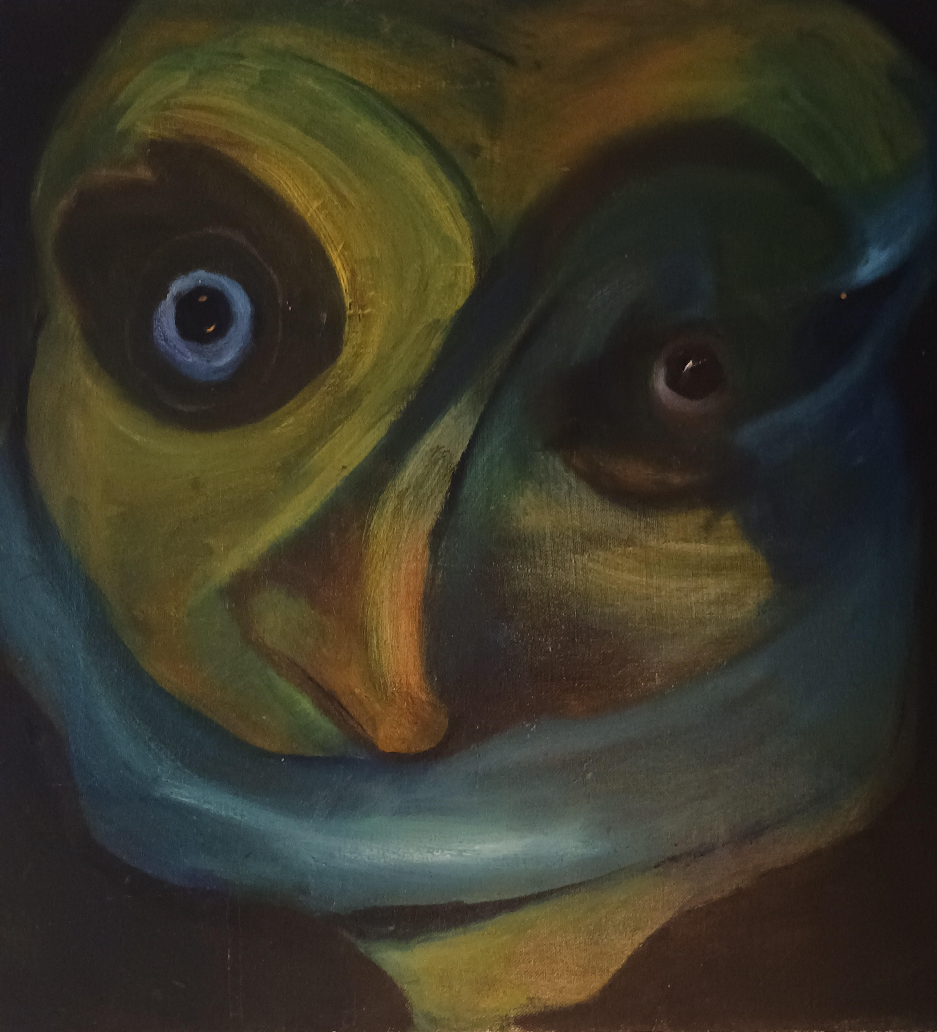 Image Description: distorted green face with the lidless left eye sunk deep in, the right eye looking almost as though it's at the bottom of a shallow hole. The nose swerves leftward at an awkward angle. Seemingly growing out of the left brow comes a blue shape, something like an arm or tentacle, that crosses the mouth and wraps around the other side of the face.