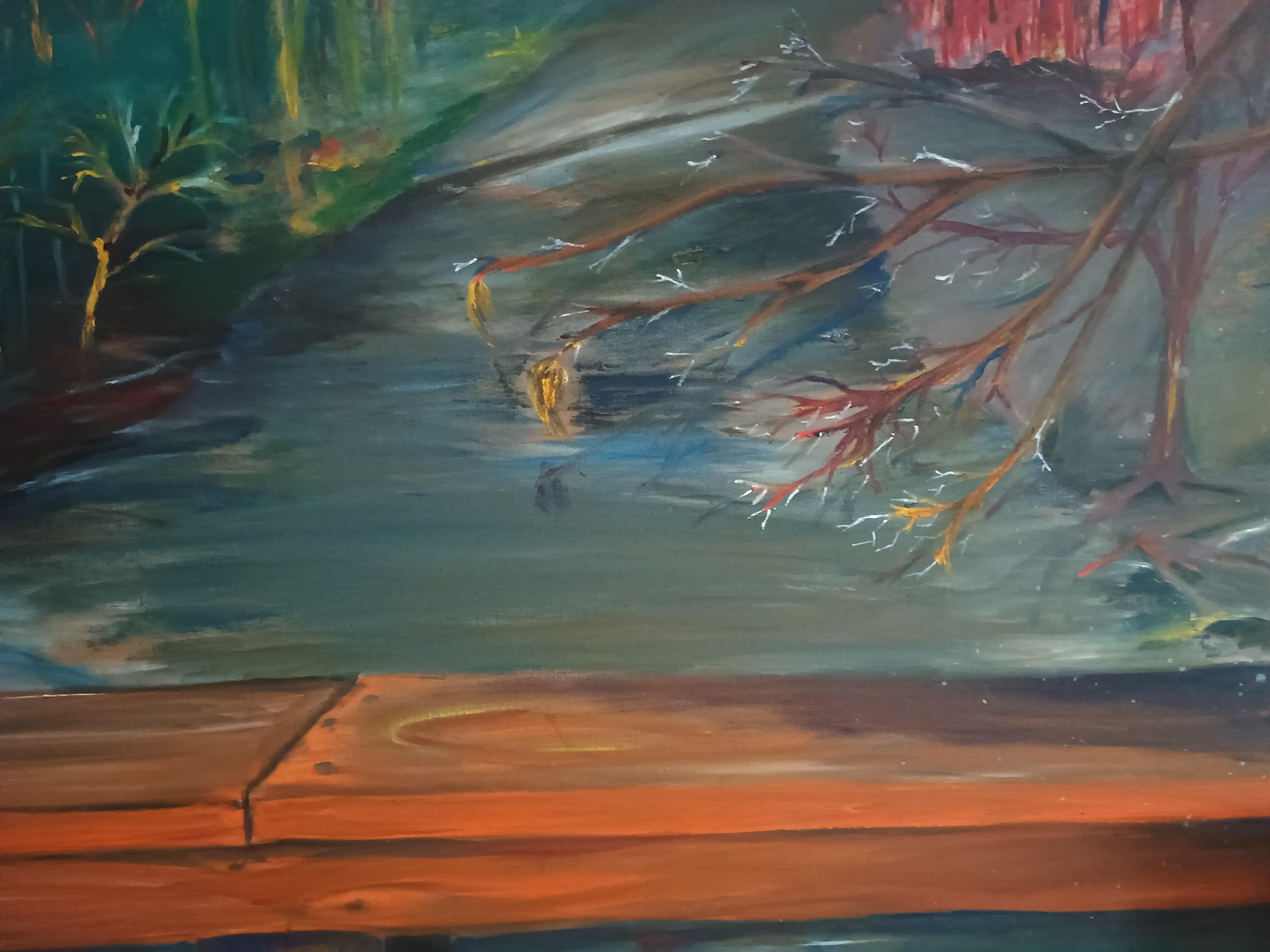 Image description: View from a bridge. The railing is bright orange, with a blue-green river flow beneath. There are red reeds beyond some trees to the viewer's right, and on the opposite bank are various plants of yellow, orange, and green, along with a small swerve of a tan tree trunk.
